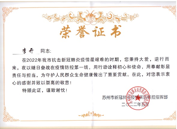 (圖3 蘇州市新冠肺炎疫情聯防聯控指揮部頒發的證書)