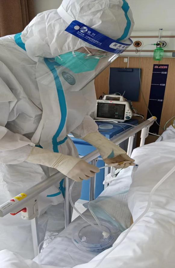 15病區大多數病人需要留置胃管鼻飼飲食,置胃管后如何判斷胃管是否在胃內成了焦點。大白與面屏的限制,用傳統的聽診方法辨別“氣過水聲”變得很困難,單單依據回抽胃液判斷又有一定的弊端。隊員楊青龍憑借自己的呼吸重癥超聲技能,使用超聲兩步法觀察食道內是否存在雙軌征,從而判斷胃管是否在正確位置,解決了臨床上的一大困難,受到了醫生和患者的認可。