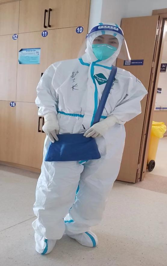李育玲主任在病房督導中發現大家身著防護服,沒有口袋裝必要的工作物品,為工作增加了好多不便。為解決這一困難,李主任回到駐地后創意的將一次性隔離衣作為原材料制作了“大白工作專用口袋”,小巧又方便,小物品卻為工作帶來了大便利!