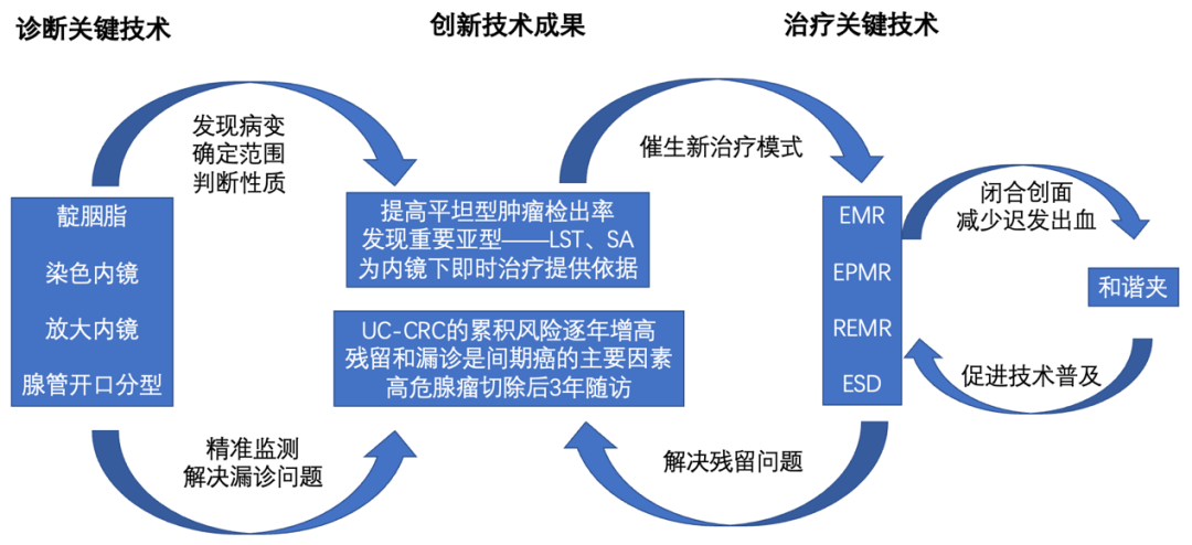 結直腸腫瘤分為隆起型和平坦型,20年前,由于對平坦型腫瘤認識不足,且在國內無商品化粘膜染色劑,染色內鏡難以開展,因此,國內早期結直腸癌的內鏡診斷率較低。為提高結直腸腫瘤內鏡下診治水平,項目組重點研發了粘膜染色劑靛胭脂并建立了以靛胭脂為關鍵試劑的染色內鏡和放大內鏡的方法,以及 EMR/ESD 等腫瘤治療微創關鍵技術,構建并完善了結直腸腫瘤的精準診治體系并應用于臨床,為結直腸癌的早診和白光內鏡難以發現的平坦型病變的診治提供了完整的內鏡下診治解決方案。